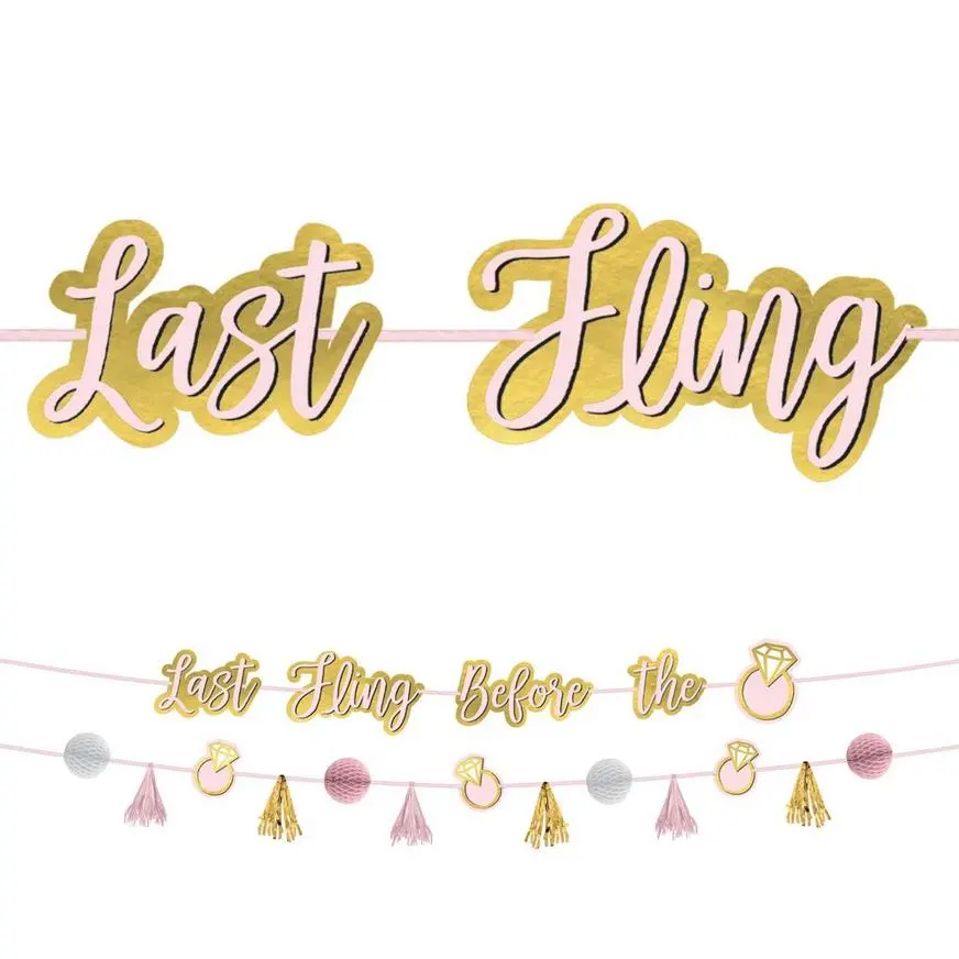 Celebrate the bride with this fun banner set, which includes the phrase “Last Fling Before the Ring” in gold font, and a ring instead of the word “ring”. The matching accent banner features gold rings, light pink tissue tassels, gold foil tassels and white and dark pink paper honeycombs.