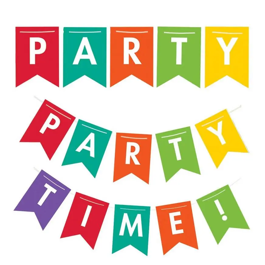 This table centerpiece features a mini pennant banner that announces that it’s “Party Time!”. It is raised on two wooden sticks between two boxes. These cardstock boxes form the base of the table decoration, together they read “Happy Bday It’s Your Day” on colorful panels. Use it to decorate the dessert table or as a centerpiece for your dining tables cape.
