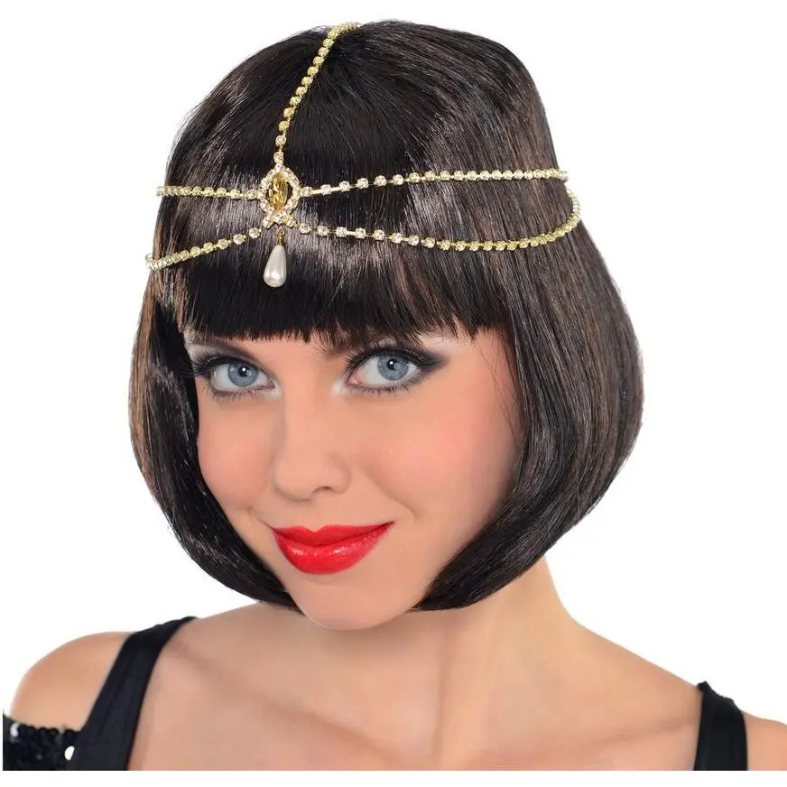 Decorate your hair in 1920s glamour with our Roaring ’20s Head Chain Hair Jewelry! This elegant hair chain features a rhinestone-embellished gold chain that wraps around the head. A teardrop pearl hangs from a champagne-colored gemstone in the center, giving this hair accessory a luxurious, expensive look. It makes a great costume accessory for your Roaring ’20s or flapper costume, and doubles as a fashionable everyday hair accessory! One size Roaring ’20s Head Chain Hair Jewelry fits most teens and adults.