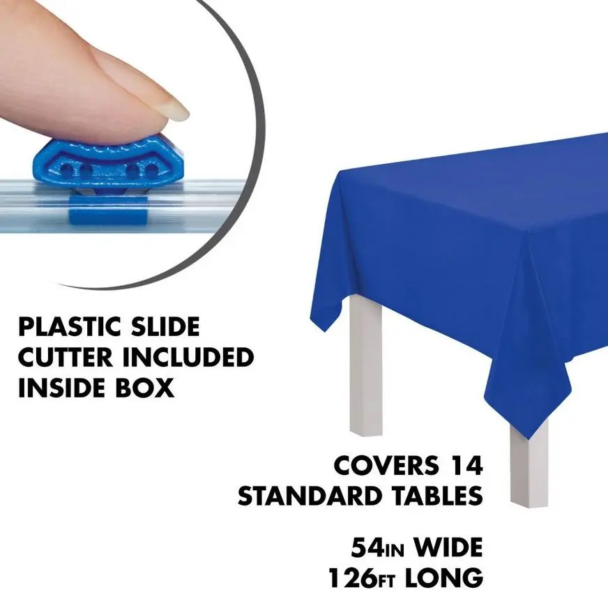 Simplify setting the table with a Royal Blue Table Cover Roll. This roll has 126 feet of bright blue plastic table cover—enough to cover 14 tables! It comes in an easy to store box that has a slide cutter conveniently built in. The slide cutter makes it easy to get the length of table cover you need to cover your table, no matter what shape!