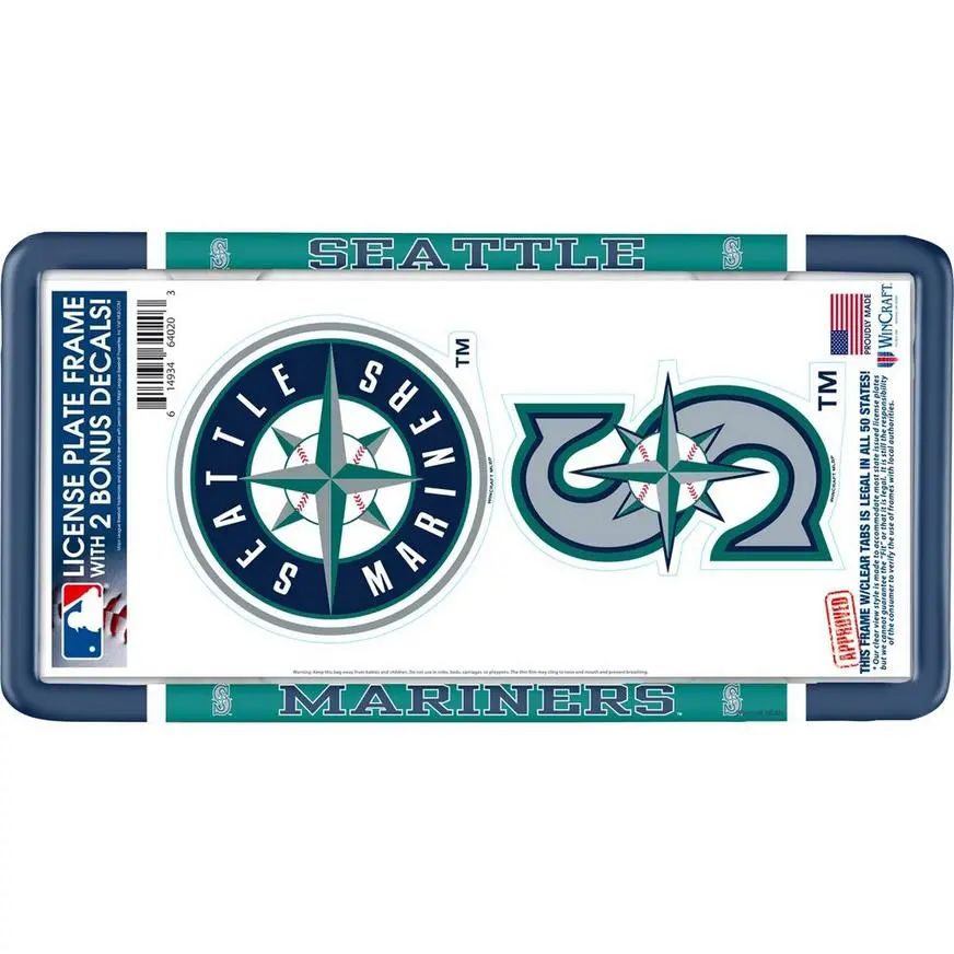 Show your support for the home team everywhere you go with the Seattle Mariners License Plate Frame with Decals. The plastic frame is blue and red and reads “Seattle Mariners.” For a little extra team spirit, the license plate frame includes two vinyl decals with the Seattle Mariners logos. Celebrate your love of the game with this three-piece set!