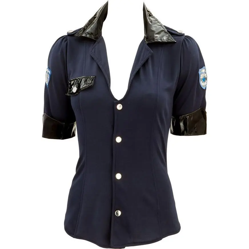 Make an arresting development in this sizzling police shirt! This Sexy Police Shirt for adults is short-sleeved, low cut, and has a value front. This blue police shirt features black vinyl trim around the collar, cuffs, and pocket. Each shoulder displays an official looking “Babe Patrol” patch — an essential party of your sexy cop costume.