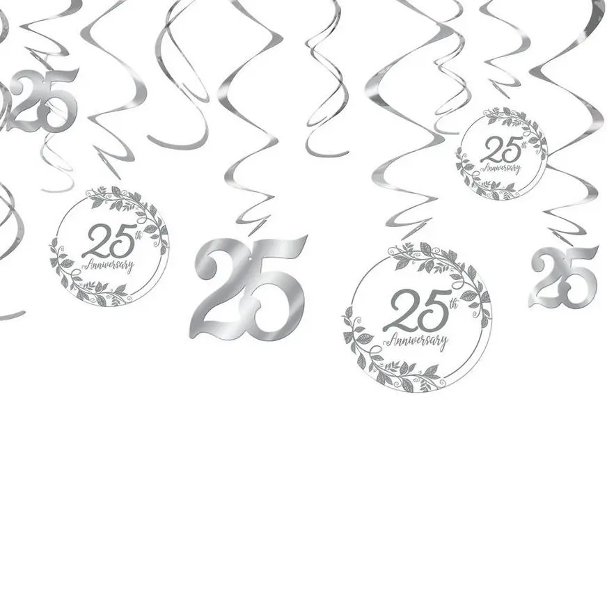Set the stage to celebrate your love milestone with 25th Anniversary Swirl Decorations! These hanging decorations feature 25th anniversary cutouts attached to silver foil swirls.
