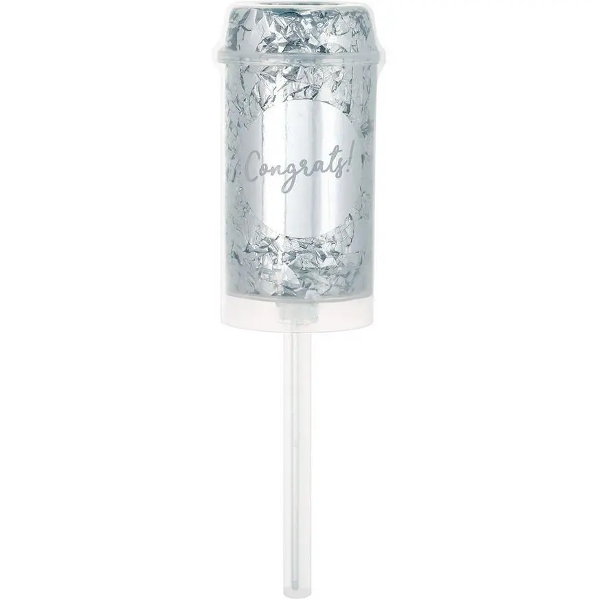 Get things poppin’ at your wedding with Silver Congrats & Love Confetti Poppers! These plastic poppers feature stickers with “Congrats” and “Love” headlines and are filled with silver foil confetti. Simply push the stick attached to the bottom up to release the confetti. Hand these confetti poppers out to the guests at your wedding!