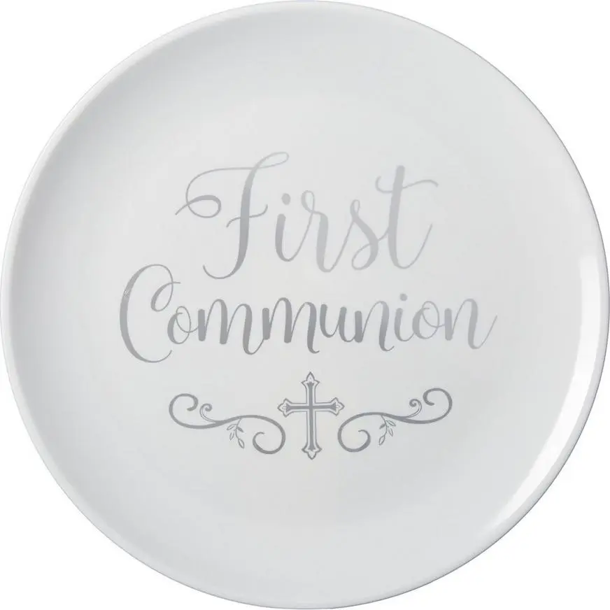 Display some delicious finger foods at your child’s First Communion reception using a Silver First Communion Round Platter! The plastic platter features the headline “First Communion” above a single cross. A round platter is a great addition to any buffet table to display appetizers, desserts, or other delicious bite-sized foods at your religious celebration!