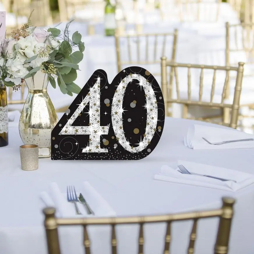 Set the table with a sparkling cardboard cutout for a picture-perfect scene. The cardboard cutout is shaped like the number “40” with a confetti background and it has an easel back for support. A themed centerpiece is an easy way to bring your loved one’s milstone birthday party to the next level, and it can even be reused as a photo prop for your selfie station!