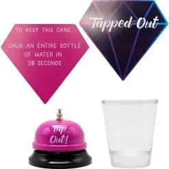Turn the party up with Tapped Out, a new twist on Truth or Dare! This game features diamond-shaped question cards, a “Tapped Out” bell, and a shot glass. Don’t want to answer a question? Then you’ve tapped out. Take a drink!