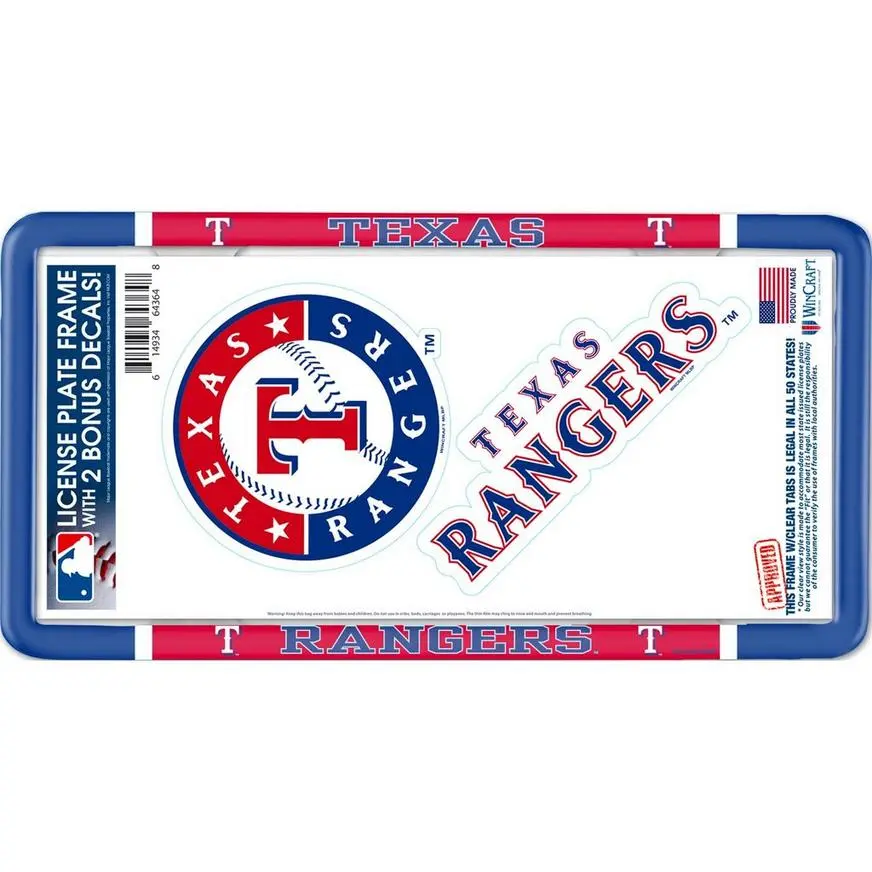 Show your support for the home team everywhere you go with the Texas Rangers License Plate Frame with Decals. The plastic frame is blue and red and reads “Texas Rangers.” For a little extra team spirit, the license plate frame includes two vinyl decals with the Texas Rangers logos. Celebrate your love of the game with this three-piece set!