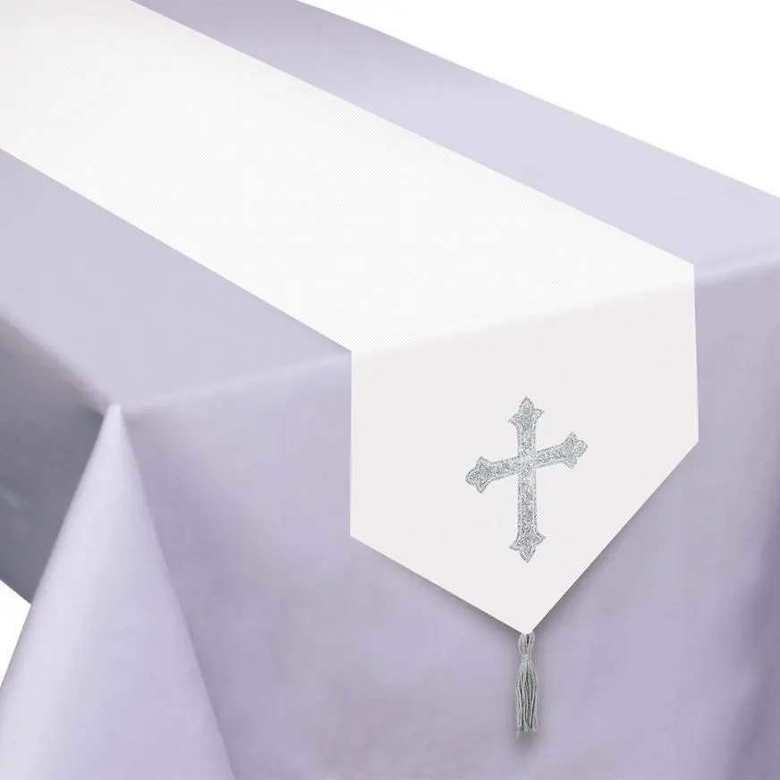 Set the table for the blessed day with this fabric table runner. The length of the table runner is crisp white with a single glittering cross symbol at each end. Matching silver tassels hang from opposite points on the runner to give it both weight and style. The neutral white and silver color scheme makes it perfect for a variety of events, like baptisms, first communions, confirmations, and even a minimal Easter Sunday display.