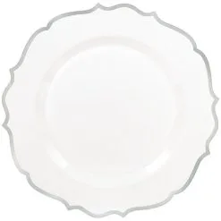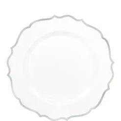 | 40 | White With Ornate Silver Rim Premium Plastic Dinner Plates, 10.5in, (SKU 937786) |